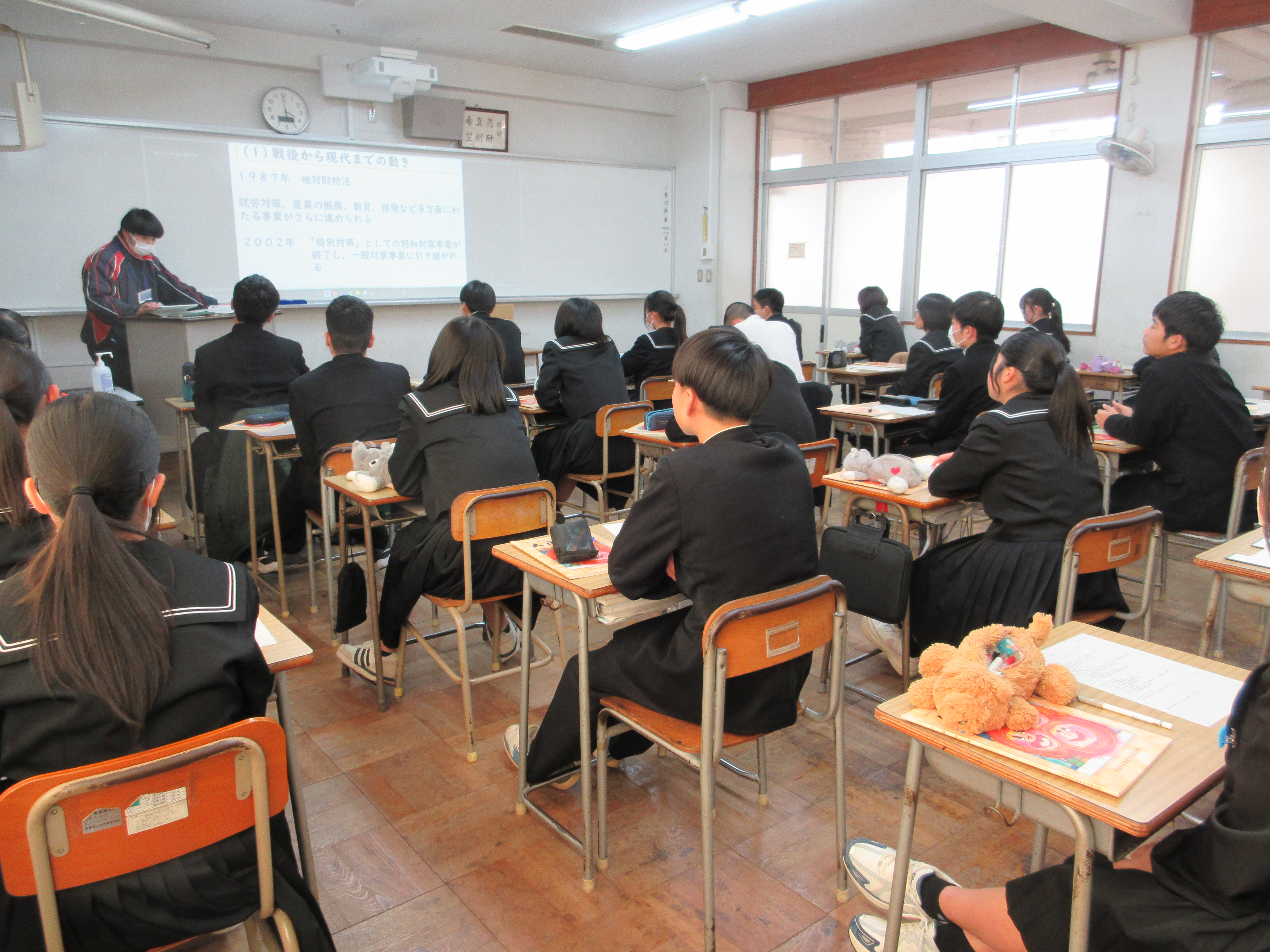 1年生は「アイヌ差別」をテーマに学習しました。2年時の修学旅行先が北海道であることから、現地の歴史や文化への理解を深めるとともに、アイヌの人々が受けてきた差別や現在も残る課題について考え、差別を許さない心の大切さを学びました。